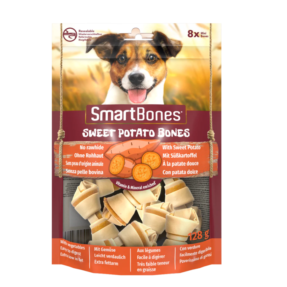 SmartBones Sweet Potato Chews combine the irresistible taste of real dried sweet potatoes with the safety of a 100% rawhide-free recipe. These chews feature a wholesome vegetable outer layer wrapped around a delicious core of real chicken.